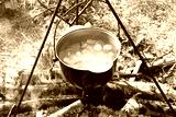 Cooking food in a kettle on a firewood fire at a picnic in summer in good clear weather