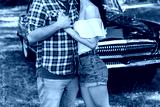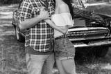 embrace.Love and affection between a young couple at the park, near the old car. a guy in a plaid plane and jeans, a girl in shorts and a white jacket. They get together in the forest for a walk.