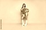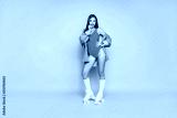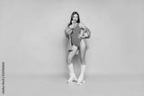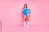 Full length size photo studio shooting portrait of sweet nice pretty cheerful glad minded lady holding hand on waist looking up on copy space isolated colorful bright vivid pastel background