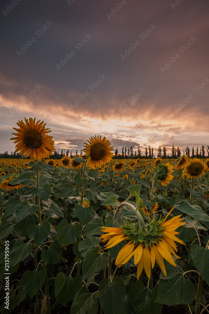 Sunset over sunflowers field