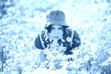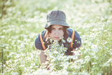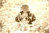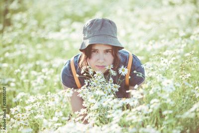 A beautiful young girl sits in a daisy field - a summer photograph in the backlight, sunny.