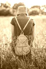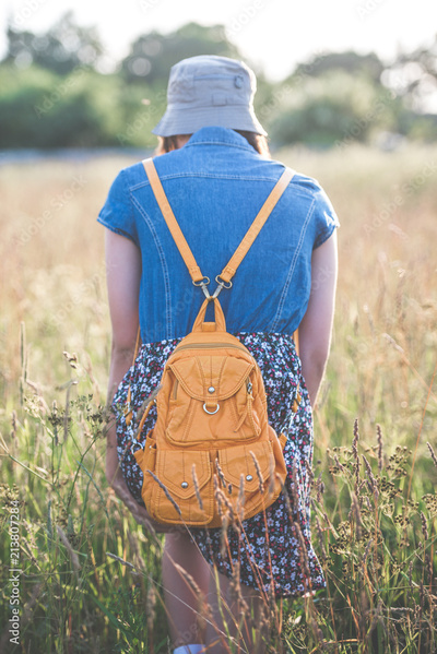 A girl in a dress and hat is walking in the field at sunset. The concept of outdoor recreation.