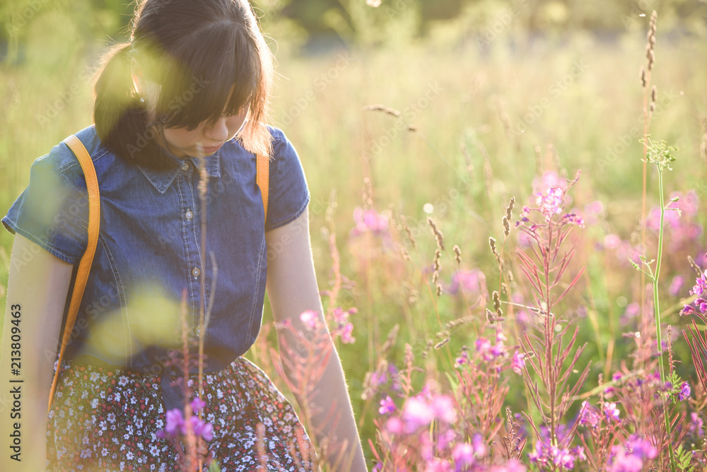 Close-up of a girl in a blooming field at sunset. Summer portrait of a girl in a field