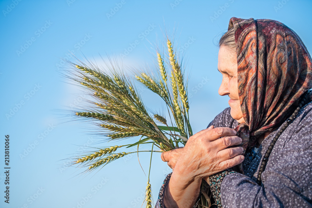 Wheat ears, hands, and the concept of harvest - an armful of grain ears in the hands against the sky.