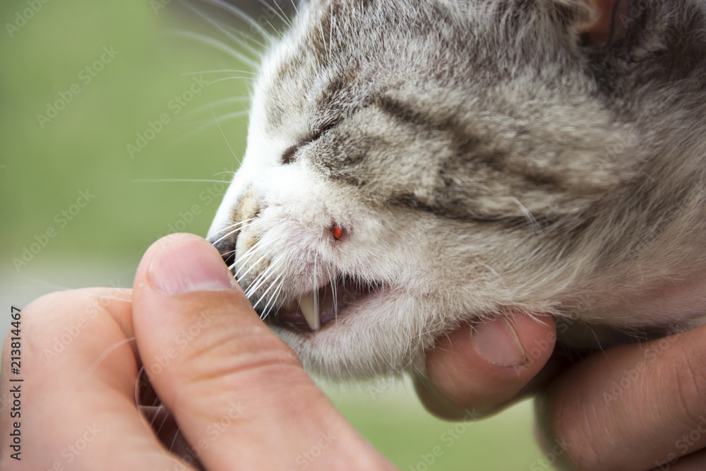 on a green background on the hand of a cat's muzzle with a parasite of a tick red blood