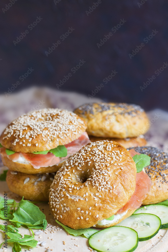 Homemade bagels with cream cheese and cured salmon. Dark background.