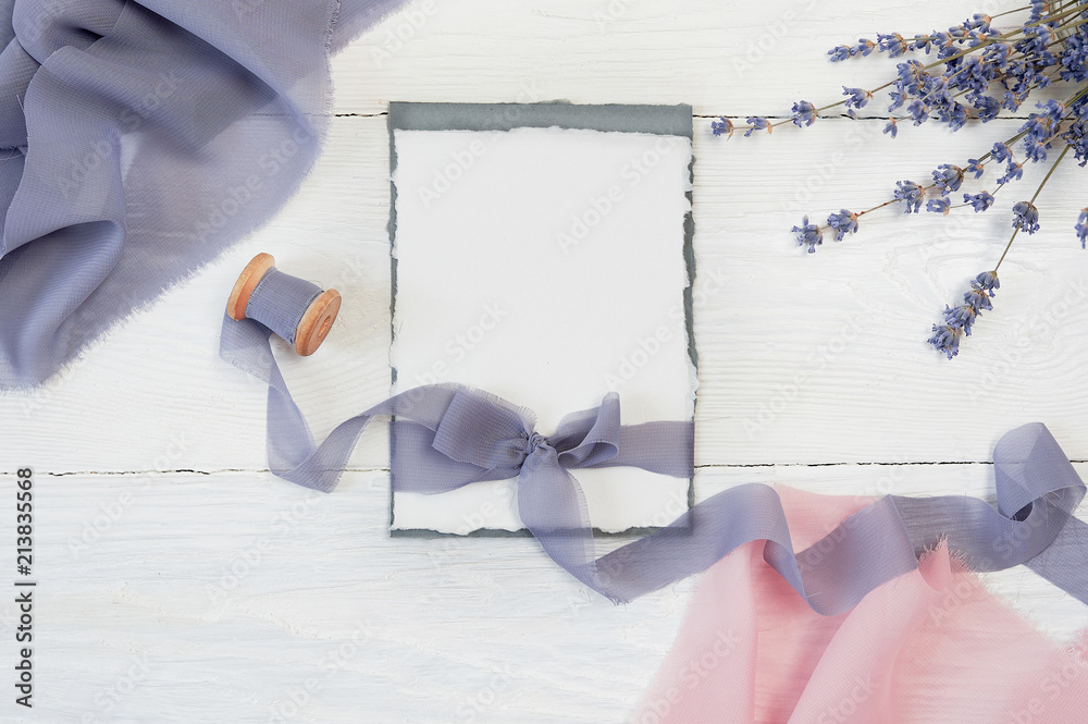 White blank card ribbon bow on a background of pink and blue fabric with lavender flowers on a white background. Mockup with envelope and blank card. Flat lay. Top view