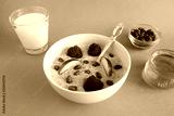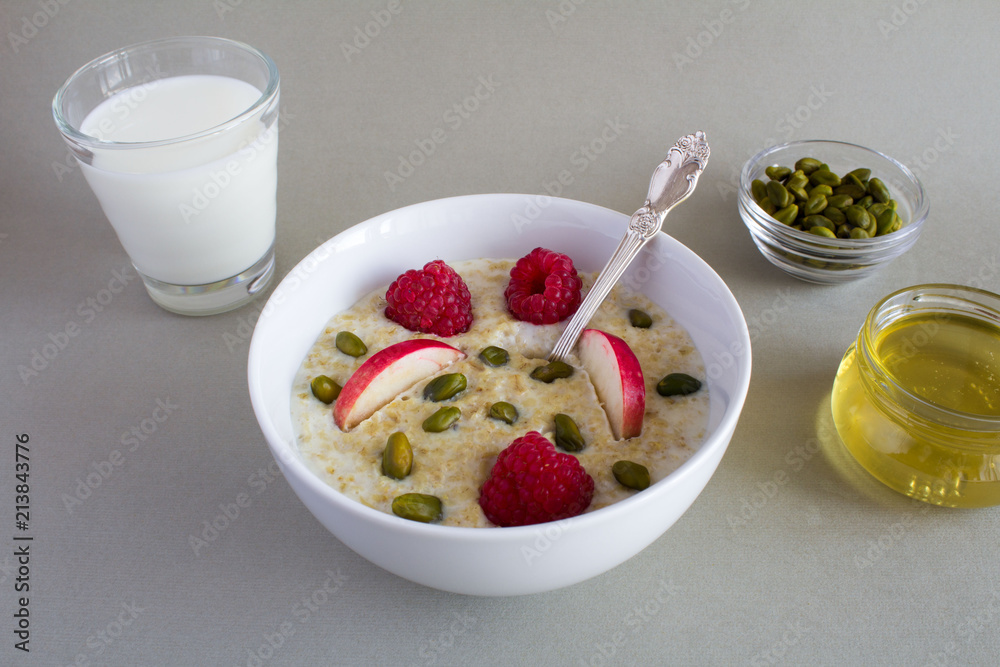 Breakfast: oatmeal with apple,raspberries, honey, nuts and milk in the glass on the grey background
