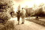Back view of grandfather with hat and grandchild walking on a nature path