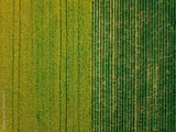 Aerial view of Rows of potato and rapeseed field. Yellow and green agricultural fields in Finland.