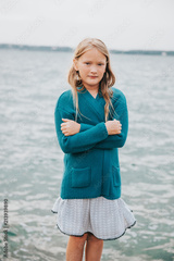 Outdoor portrait of adorable little girl playing next to lake, wearing white dress and green cardigan jacket