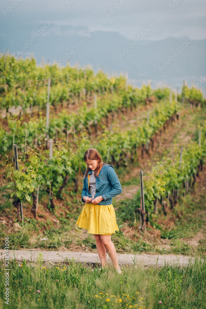 Outdoor portrait of pretty teen girl, hiking in Lavaux vineyards, Switzerland