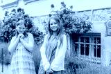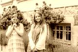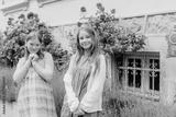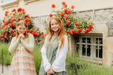 Portrait of two adorable little girl playing together outside