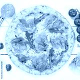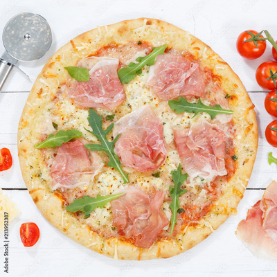 Pizza Prosciutto Schinken Quadrat Zutaten backen von oben auf Holzbrett
