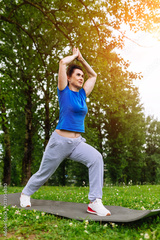 Aged female doing yoga exercise in park. Senior woman practicing yoga outdor. Heathy life style concept. Copyspace.