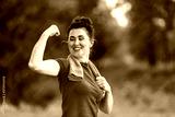 Smiling Senior woman flexing muscles outdoor in park. Elderly female showing biceps. Heathy life style concept. Copyspace.