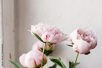lovely peony pink and white flowers on background of wall, sweet home, rustic