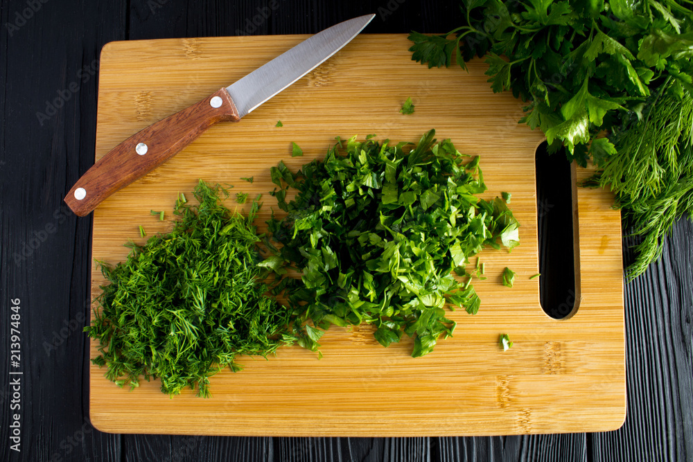Chopped parsley and dill on the cutting board on the black wooden background.Top view.