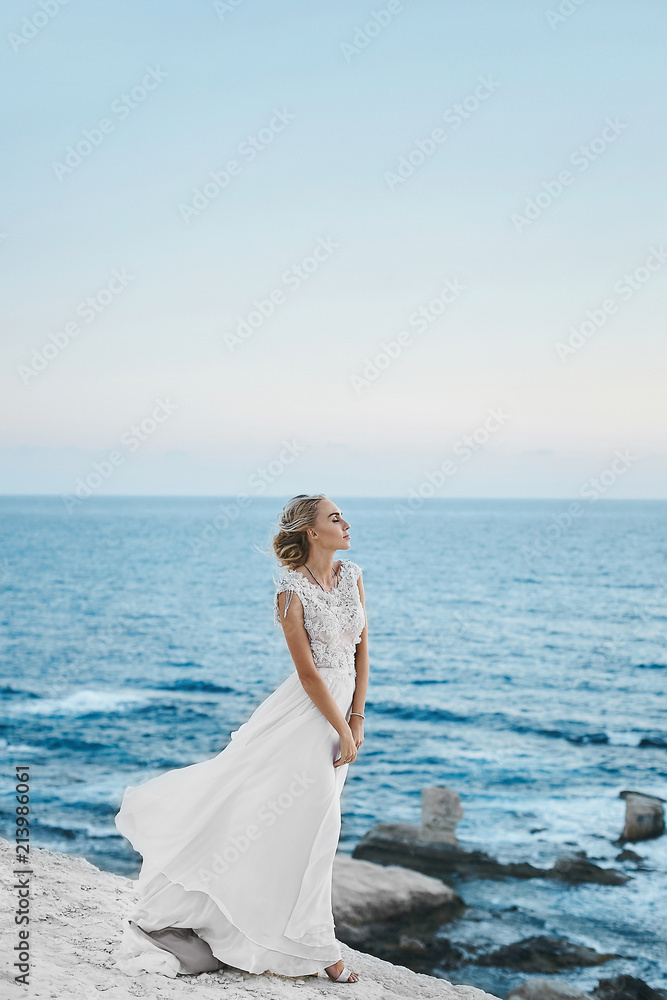 Sensual and fashionable blonde model girl with perfect body in stylish white lace dress with naked back, stands on the white rock at the sea coast