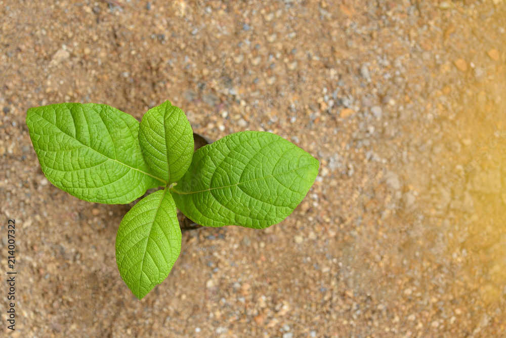 Teak seedlings placed on the sand. Ready to be planted in the garden. Top view.