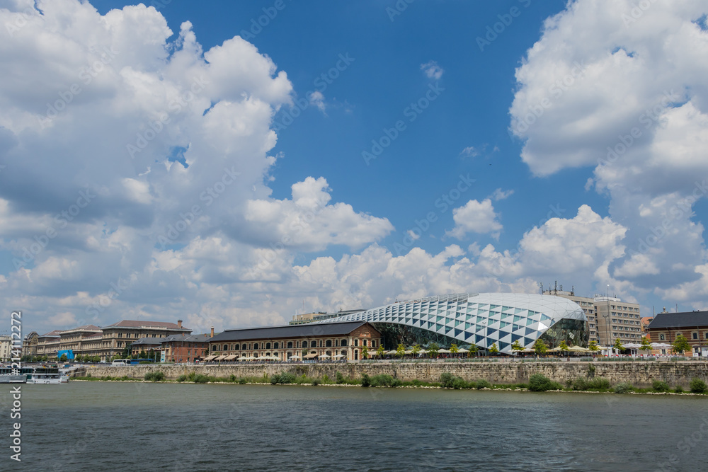 Budapest cityscape seen from one of the Danube bank to the another under the blue cloudy sky on a sunny day