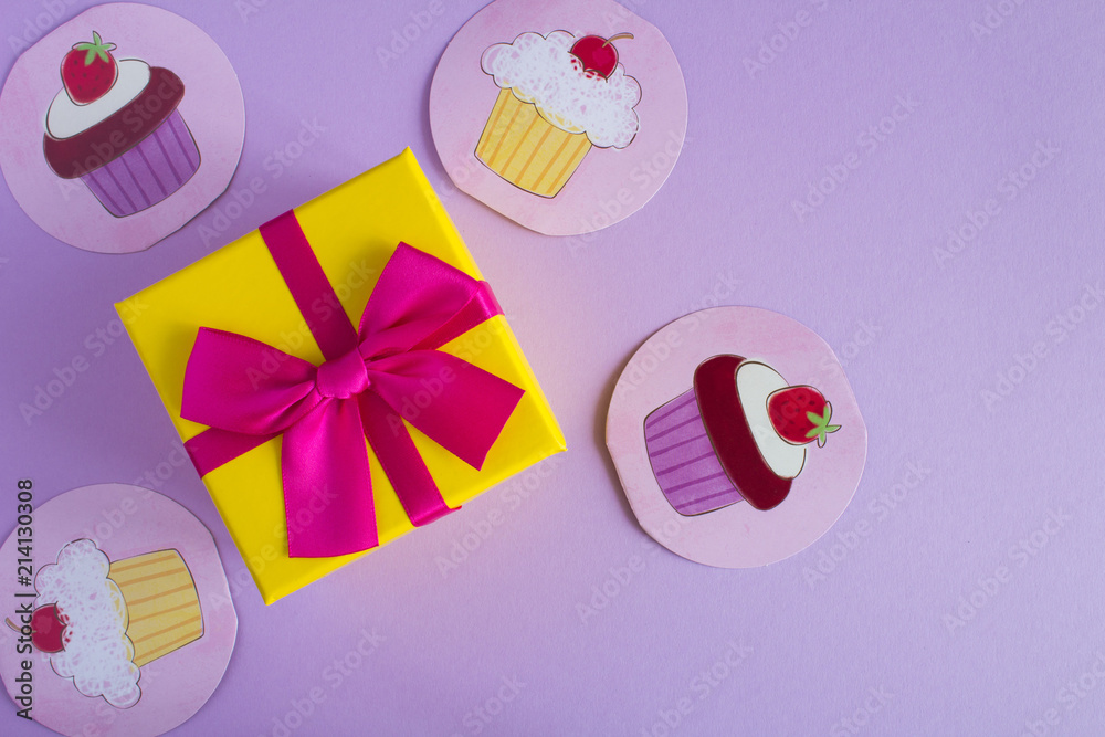 Children's gift with pink bow and hearts on the violet background.Top view.Copy space.