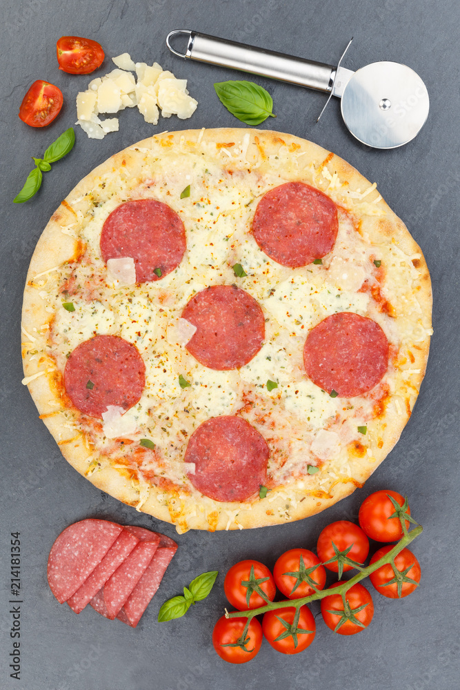 Pizza Salami von oben Zutaten backen Hochformat Schieferplatte