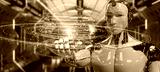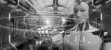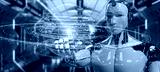 White robot using digital sphere connection hologram 3D rendering