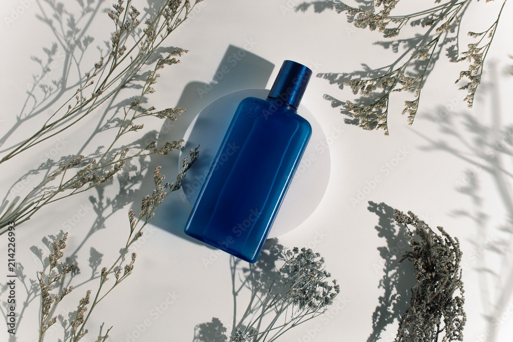 blue fashion perfume fragrance luxury with white background and dried flower flora on sun light and shadow morning.psd
