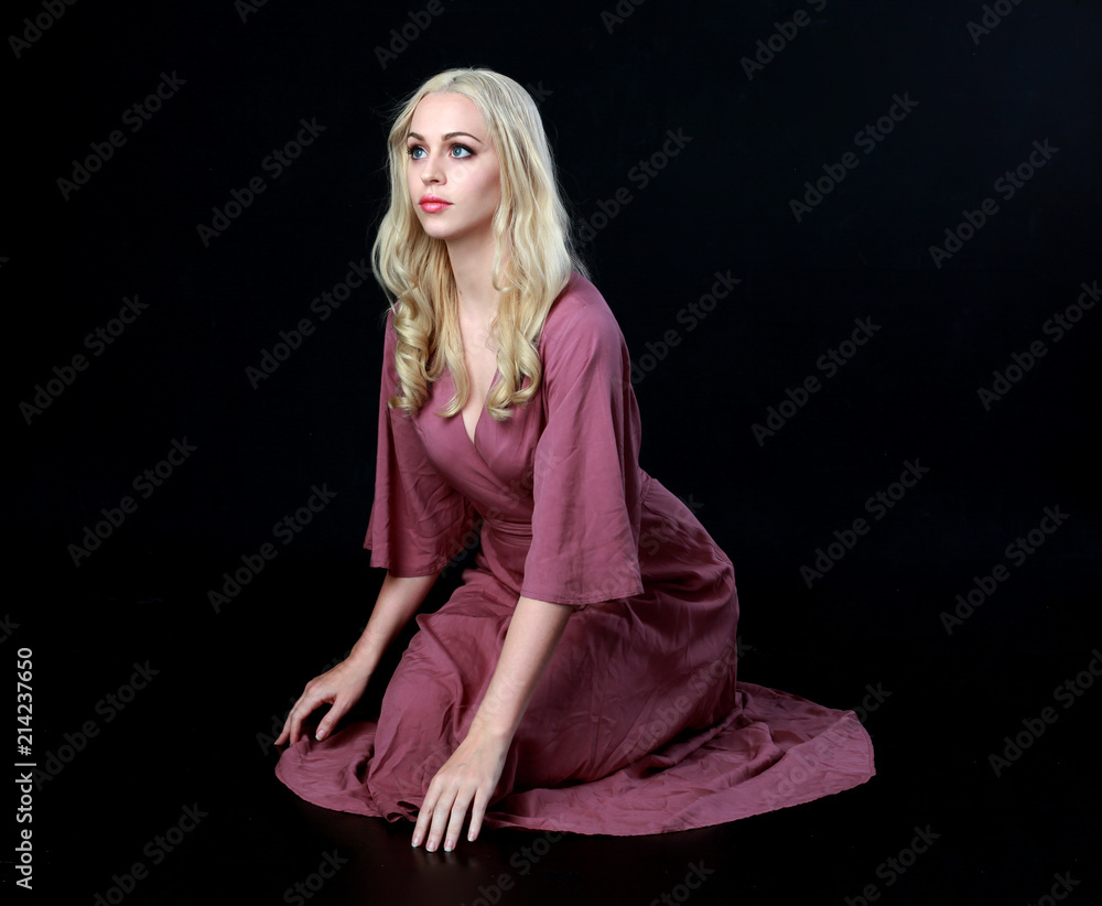 full length portrait of blonde girl wearing long purple dress. seated pose. black studio background.