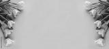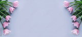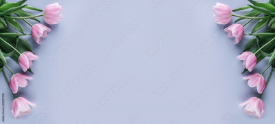 Pink tulips flowers over light blue background. Greeting card or wedding invitation. Flat lay, top view, copy space.