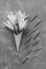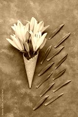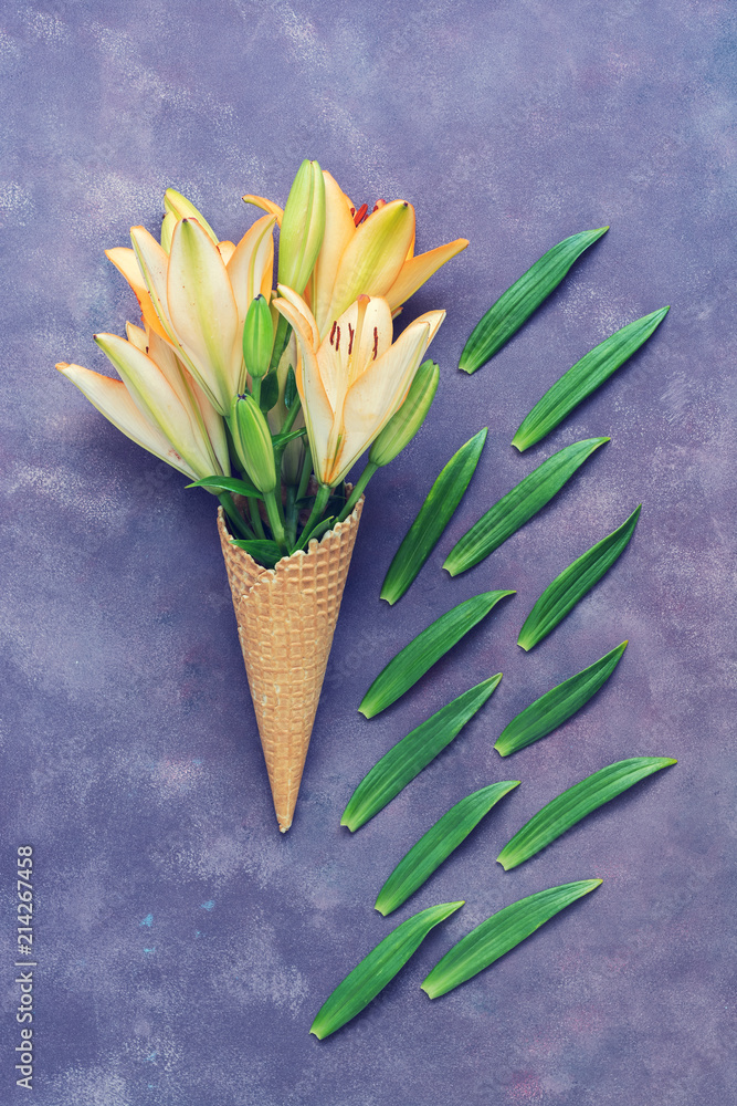 Beautiful composition of flowers on a blue background. Lilies in a waffle cone. Flat lay.