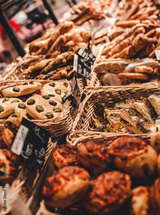 Variety of delicious breads, pizza, buns,pastry, displayed on shelves in Bakery shop.