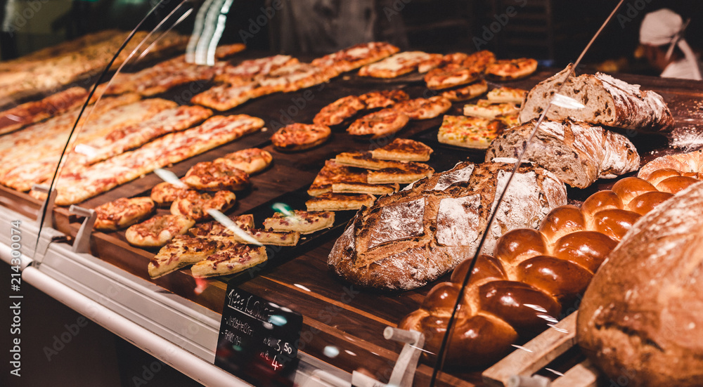 Variety of delicious breads, pizza, buns,pastry, displayed on shelves in Bakery shop.