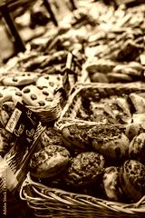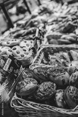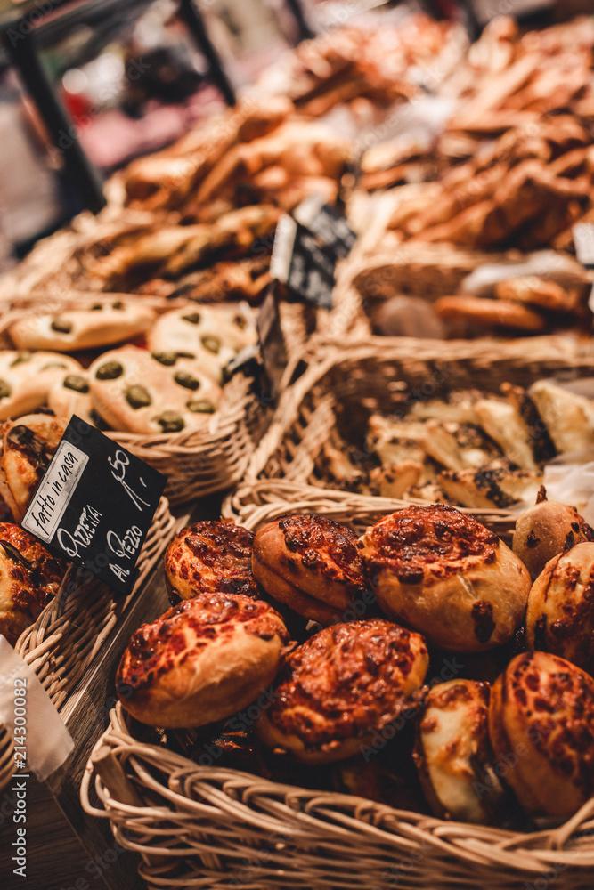 Variety of delicious breads, pizza, buns,pastry, displayed on shelves in Bakery shop.