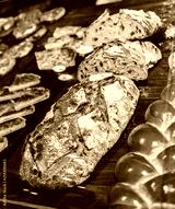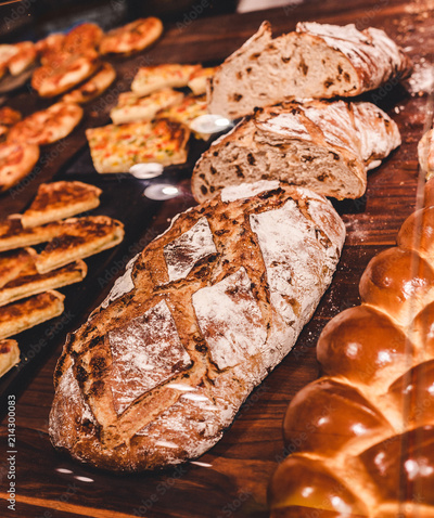 Variety of delicious breads, pizza, buns,pastry, displayed on shelves in Bakery shop.