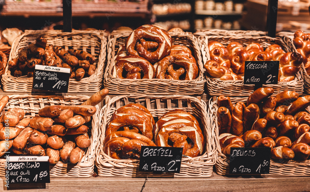 Variety of delicious breads, pizza, buns,pastry, displayed on shelves in Bakery shop.