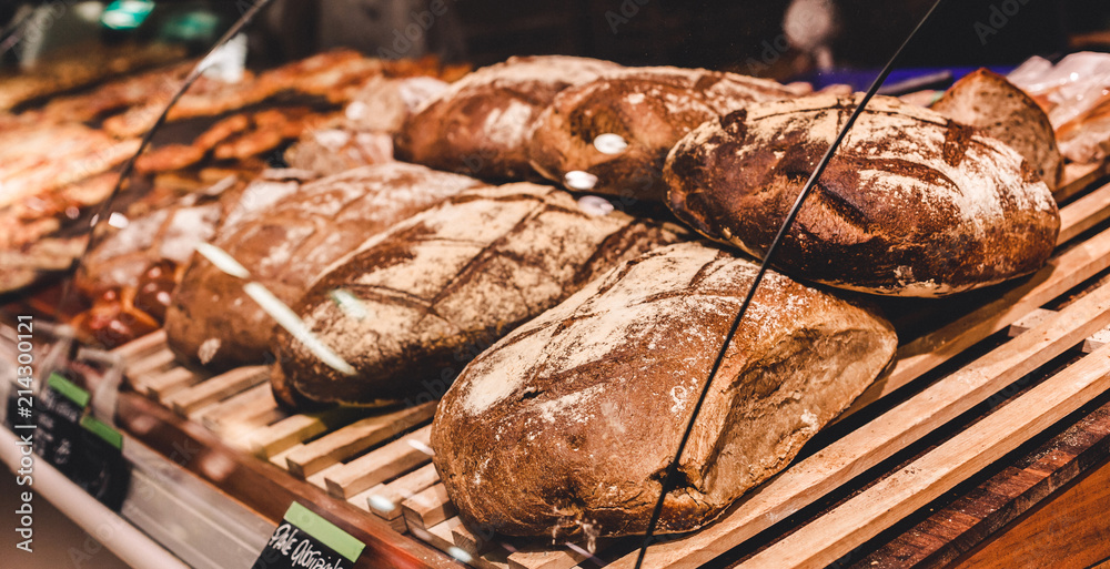 Variety of delicious breads, pizza, buns,pastry, displayed on shelves in Bakery shop.