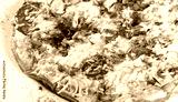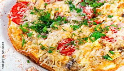Omelette with slices ham, mushrooms, greens, cheese and tomato on dark wooden background. Hot and healthy breakfast, pizza.