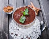 Italian dessert tiramisu in glass on dark wooden background, sweet food. Top view