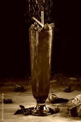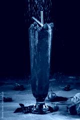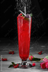 Cold red cocktail with red currant, orange and ice in tall glass on dark background. Summer drinks and alcoholic cocktails.