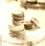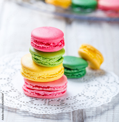 Colorful tasty macaroons on napkin, natural light selective focus. Sweet and colorful dessert close up.