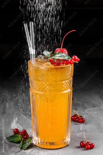 Fresh orange lemonade with mint, orange and ice in glass jar over dark background. Summer drinks and cocktails.