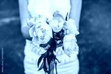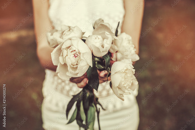 Girl's hands holding bouquet of peonies flowers on outdoor. Selective focus. Toning.
