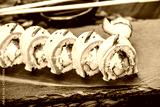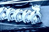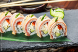 Sushi rolls set with salmon, cream cheese, red caviar, avocado and wasabi on black stone on bamboo mat, selective focus