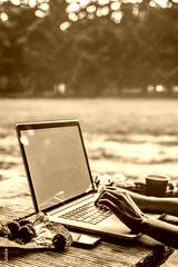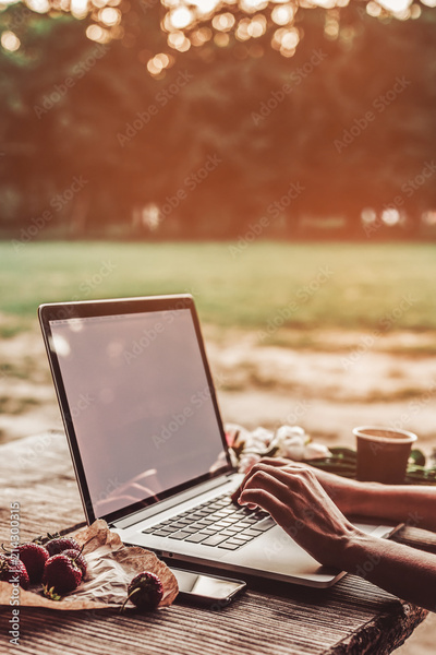 Young woman using and typing laptop computer at rough wooden table with coffee cup, strawberries, bouquet of peonies flowers