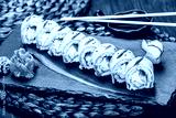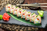 Sushi rolls set with salmon, cream cheese, red caviar, avocado and wasabi on black stone on bamboo mat, selective focus