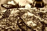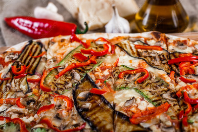 Delicious pizza with chicken, zucchini, eggplant, pepper, cheese and mushrooms on wooden rustic table. Top view. Toning.