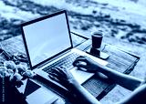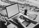 Young woman using and typing laptop computer at rough wooden table with coffee cup, strawberries, bouquet of peonies flowers