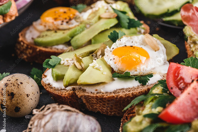 Whole grain bread sandwiches with fried quail egg, avocado, herbs and seeds on black background. Clean eating.